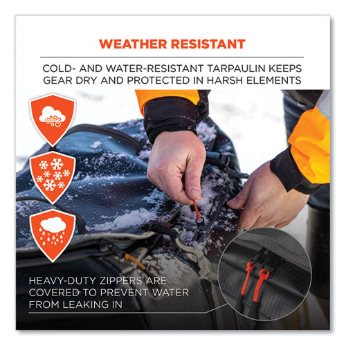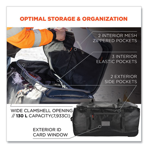 The Arsenal 5032 Water-Resistant Wheeled Duffel Bag is built tough to withstand harsh conditions, with heavy-duty cold- and water-resistant tarpaulin and 600D coated polyester to keep gear dry and protected in any season. Durable zippers on the top clamshell opening are also covered by an overhang to prevent water from leaking inside. With heavy-duty wheels, an adjustable retractable handle, padded carrying handles and self-standing bottom supports, this travel bag is a great option for work and recreation alike. The large clamshell compartment opens wide for convenient access when packing or unpacking, while the squared shape of the bag helps maximize storage space. For accessory storage and organization, the main compartment features two mesh zippered top pockets, two large zippered side pockets and three elastic side pockets. A light gray interior makes it easy to spot gear inside the bag.