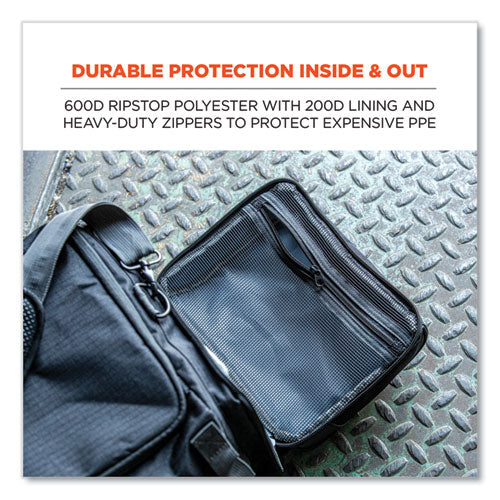 The Arsenal 5189 Work Gear Duffel Bag makes for easy transport and storage of work gear on and off the worksite, including hard hats, fall protection, safety vests and more. Built to protect with 600D ripstop polyester and 200D nylon lining, plus a padded shoulder strap for comfort when transporting heavy gear. The interior compartment is strategically designed with a variety of dividers and pockets for convenient gear organization. In addition to large capacity for storing all the essentials, the main clamshell compartment features an internal divider plus elastic pockets for eyewear and water-resistant tarpaulin pockets. Three exterior side pockets provide extra storage, while an ID card window holds business cards and jobsite IDs for easy identification. Featuring reflective striping for enhanced visibility.