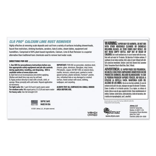 Powerful, trusted multi-use cleaner dissolves even the hardest calcium and lime buildup, rust, mineral deposits, hard water stains, soap scum, and oxidation. Certified EPA's Safer Choice for safer chemistry means that this formula is safe for use in a wide variety of applications including dishwashers, coffeepots, sinks, toilets, glass, siding, stucco, sprinkler systems and more! CLR PRO Calcium, Lime and Rust Remover is NSF Registered and is approved for use in food processing, food storage, and food service facilities. Plumbing and septic safe. Phosphate-, bleach-, ammonia- and alcohol-free.