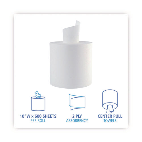 Center-pull Roll Towels, 2-ply, 10 X 7.6, White, 600/roll, 6/carton