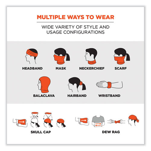 The Chill-Its 6485 Multi-Band offers head and face protection from the sun, dust and flying debris. Plus, it features moisture-wicking technology to absorb sweat and wick moisture away. This multi-band features supremely versatile performance fabric with a multitude of uses and ways to wear. This PPE safety headwear is incredibly versatile. The soft, stretchable knit material allows the multi-band to be worn as a cooling headband, neck gaiter, face mask or face covering, hat, dew rag and more. It can also be worn under a hard hat to wick moisture on hot days. Anti-Odor treatment keeps it fresh all day long. Hang dry or machine wash as needed. Great for construction, landscaping, roofing, or anybody working in the heat. It can also be used to keep cool and reduce the risk of heat stress while gardening, hiking, playing sports and more.