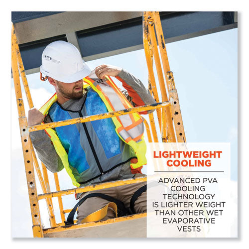 The Chill-Its 6667 Wet Evaporative Cooling Vest is made with a lightweight PVA material that provides immediate cooling relief to the core area. The lightweight construction is designed with breathable mesh panel siding making it more comfortable than other wet evaporative vests that can be heavy to wear. A front zipper offers an easy on/off, customized fit. For best results, we recommend this body cooling vest be worn over a t-shirt and not covered by other clothing. In order to activate, simply run under water and wring out, no ice or refrigeration is needed. The PVA material is super evaporative and feels cooler than ambient air, keeping you feeling cool and comfortable for hours. Machine wash as needed and hang dry for longest life, the vest will stiffen as it dries. All PVA materials dry stiff, to reactivate and soften, run under water. Great for construction, landscaping, roofing, or anybody working in the heat.