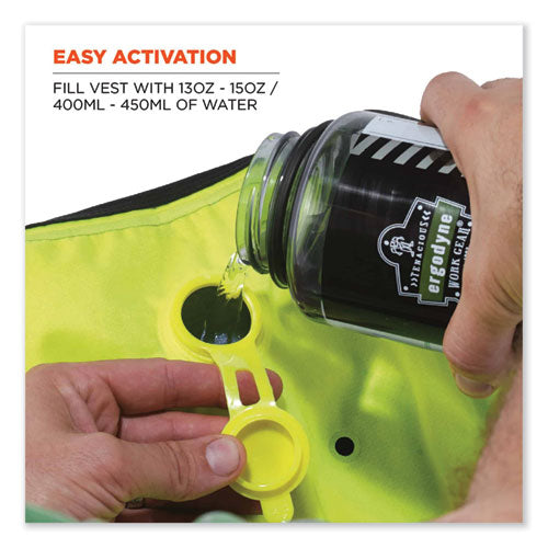 The Chill-Its 6685 Dry Evaporative Cooling Vest offers immediate dry cooling relief that lasts up to three days. The exclusive dry evaporative technology keeps the wearer completely dry and comfortable as opposed to other cooling vests on the market that require soaking. Constructed with high-visibility industrial grade quality nylon to perform in the toughest conditions. Designed with front zipper closure, and the mesh side panels provide additional ventilation and stretch for a comfortable fit. This lightweight cooling vest is machine washable and can be reused over and over. To activate, simply fill the vest with 13 oz to 20 oz water for immediate and long-lasting cooling relief. Not to be worn underneath thick layers of clothing, this vest needs airflow in order to activate and for the evaporation process to take place. Do not clean the inside reservoir. Cooling material is treated with an antimicrobial that inhibits mold growth on the product.