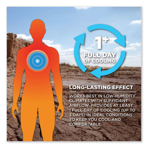 The Chill-Its 6687 Dry Evaporative Cooling Vest offers immediate and dry cooling relief that lasts up to three days. With its exclusive dry evaporative technology, this cooling vest keeps the wearer completely dry and comfortable, as opposed to other cooling vests on the market that require soaking and get you wet. To activate, simply fill the vest with 13.5 oz to 15.5 oz of water for immediate and long-lasting cooling relief. No refrigeration or gels necessary! The cooling process can last up to three days depending on humidity and heat levels. High humidity levels can slow down airflow and may reduce cooling abilities.