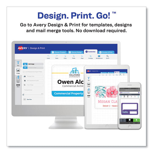 These badges feature a durable, easy-to-load, open top, pocket-style design. White micro-perforated name badge inserts are printable on both sides and separate cleanly leaving smooth edges. Create badges with text and colorful graphics using free designs and templates with Avery® Design & Print. Plastic holder is reusable and displays names clearly. 8.5 x 11 sheets for laser and inkjet printers.