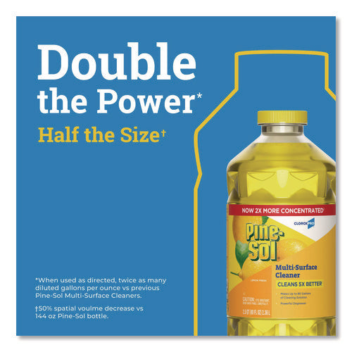 With Pine-Sol® Multi-Surface Cleaner from CloroxPro, you only need one cleaner to fight tough dirt, grease and grime. This 2X concentrated formula delivers more cleaning power per drop and cleans 5X better than the previous Pine-Sol® scented formula. Easier to handle and easier to store, the space saving bottle size gives you more cleaning solution in a smaller bottle made of 30% less plastic. This multipurpose cleaner cleans right the first time, removing stains and deodorizing soft surfaces while leaving a clean scent. This powerful degreaser cuts through grime and soap scum fast and is safe for use on wood, tile, stone, porcelain, and glass and more when used as directed on hard nonporous surfaces. Do not use on marble, aluminum, copper or wood that is unfinished, unsealed, unpainted, waxed, oiled or worn.