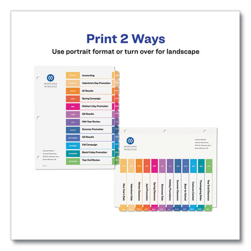 Organized documentation makes a business run like a well-oiled machine. These Ready Index Table of Contents Dividers help you stay organized so you can locate documents quickly and efficiently. They feature preprinted multicolor tabs that can be displayed in either landscape or portrait format. Using free templates from Avery Design & Print you can customize the included table of contents page and print in minutes. Organization and efficiency-makes life better for your business. For laser and inkjet printers.