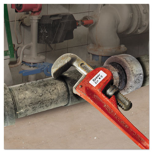Extra-strong, ultra-permanent adhesive sticks securely to wood, metal, glass, rough plastic, cement and more. Durable, scuff- and tear-resistant material withstands exposure to moisture and moderately strong cleaners, such as: ammonia, multipurpose cleaners, hand and surface sanitizers, bleach and soap. Great for quick labeling of tools, equipment, parts bins and various objects in nearly any environment: offices, warehouses, manufacturing facilities, maintenance shops, etc. Handwrite with permanent marker to ensure long-lasting identification (standard ink may wash off). Not for use with copiers or printers.
