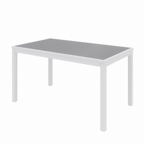 Package Includes: Gray 32" x 55" Rectangular Table Top; 29" Tall White Aluminum Square Leg Table Base; (6) Gray Powder-Coated Polymer 18" Seat Height Chairs