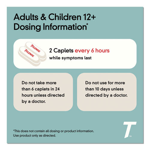 Tylenol® Extra Strength caplets help reduce fever and provide temporary relief of minor aches and pains. From the #1 doctor-recommended brand of pain reliever, each caplet contains 500 mg of acetaminophen for effective, extra strength pain relief. Both a fever reducer and pain reliever, it relieves minor aches and pains due to headache, backache, toothache, minor pain of arthritis, the common cold, and premenstrual and menstrual cramps. When used as directed, it has an excellent safety profile and can be used by adults and children 12 years and older.