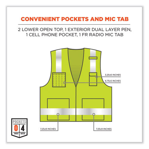 The GloWear 8262FRZ Class 2 FR Surveyor Zipper Vest is FR compliant to NFPA 70E for protection against arc flash hazards. The unique combination of solid front and mesh back makes this flame-resistant safety vest first-of-its-kind in storage and breathability. Designed to be worn as part of a complete fire-resistant (FR) garment system, it is tested and certified to an ATPV 6.6 cal/cm2 (front) and ATPV 4.6 cal/cm2 (back). Made with a solid front of breathable, moisture-wicking and ANSI-compliant 5.5 oz Westex by Milliken DH material for protection against arc flash, and a 5.6 oz Modacrylic mesh back for even more cooling airflow. It also features a 2" 3M Scotchlite FR reflective accents for heightened visibility at night or in low light environments. With four exterior pockets, the front of this surveyor vest provides an abundance of storage. Pockets include two lower flap top pockets, one cell phone pocket and a dual-layer pen pocket, plus a single radio mic tab made of FR body material.