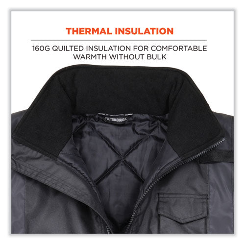 The GloWear 8377EV Thermal Enhanced High Visibility Jacket is designed with a polyester outer shell + PU coating for water- and wind-resistant protection from the elements, plus 160 g thermal quilted insulation for comfortable no-bulk warmth. With unique 2" black reflective tape set on black fabric, this jacket maintains a low-profile look in the daytime while enhancing visibility at night or in low-light conditions. The adjustable inset hood features drawstrings and stoppers for a custom fit, and can easily be zipped in or out depending on weather conditions or personal preference. Adjustable hook and loop cuffs seal out cold and allow for comfortable wear with gloves. A full front zippered closure makes for easy on and off. This work jacket features two lower front pockets, one upper chest cell phone pocket, one dual slot pen pocket and two mic tabs for convenient access and storage.