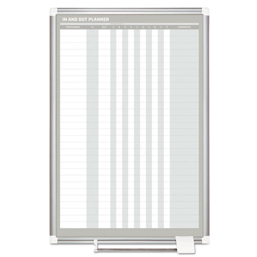 In & Out board features rows for employees or visitors and is perfect for displaying staff schedules. Magnetic Gold Ultra™ lacquered steel dry erase surface is recommended for frequent use. Sliding aluminum pen tray keeps markers and magnetic accessories where you want them. Aluminum frame features the four-corner system for easy mounting.