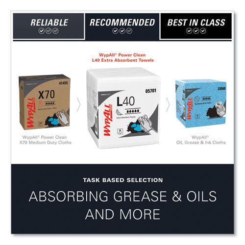 Regardless of your task, industry or budget, our WypAll® wipes, towels and cloths are designed to give you the durability, absorbency and versatility of a laundered cloth with the cost efficiency and hygiene of a disposable. Trust the WypAll* Brand, the one that sets the standard for excellence in wipers. WypAll* L40 Towels are effective wipers that absorb liquids lightning-fast. These towels are made of bonded cellulose using DRC (double re-creped) technology for strength, softness and absorbency. As a wiping towel, it soaks up liquids fast, but all you'll feel is softness, thanks to a plush, touchable outer layer. In fact, it's a popular choice for patient wiping in healthcare industries, for bathing and patient drying. These utility towels are specially designed to absorb liquids, lubricants and oils (in restaurants for wiping counters, in mechanic shops, industrial and commercial factories and more), yet they're soft enough for use on face and hands. Experience the difference in superior absorbency and cleaning at your home or office today! As we look towards the future, Kimberly-Clark Professional is committed to providing a wide collection of essential products and services that help make your workplace exceptional. Our dedication to innovation has helped businesses confidently navigate change and empowered people at work for nearly 150 years and we are committed to do so for years to come.