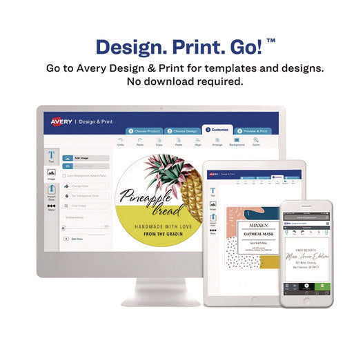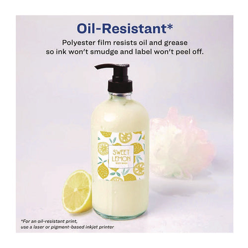 Whether you're running your own daycare, catering business or selling products, Avery 64510 Durable Waterproof Labels are the best choice for creating quality labels that last. Our water and oil proof labels are created with high-grade polyester film and a strong permanent adhesive that will keep your labels secure. Create your own essential oil labels, CBD labels, bath & beauty labels, candle labels, beverage labels and more with hundreds of customizable Avery templates. Sure Feed technology reduces jams or smudges by creating a more reliable feed through your printer.The patented Easy Peel label design makes these labels easy to peel and quick to apply. Just bend the label sheet, peel off your labels and fold the sheet back flat. The permanent adhesive ensures that your labels stick and stay without curling, peeling or falling off. Please Note: Waterproof when used with laser or pigment-based inkjet printers. Ink from traditional dye-based inkjet printers may smear when wet or exposed to moisture.