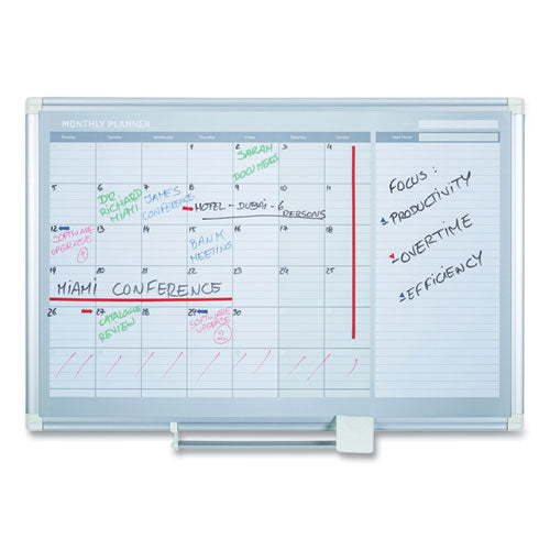 Organization is vital for the success of every business or enterprise. MasterVision® Planning Boards are excellent tools that allow you to keep scheduling and planning on time. Keeping important dates and tasks on display, organizing work-groups or just planning ahead is practical and easy. Magnetic Gold Ultra™ dry erase board allows you to post notes and messages as well as write. The lacquered steel surface is suitable for frequent use. Sturdy aluminum frame features an adjustable tray and the four-corner system for easy mounting.