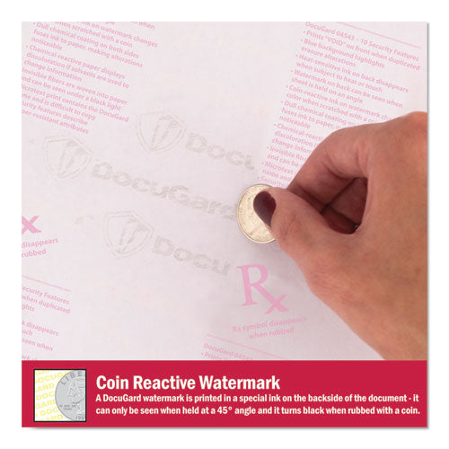Prevent unauthorized copies and safeguard confidential business, legal, healthcare and personal documents. Designed to meet and exceed federal guidelines for tamper-resistant security paper set by the Centers for Medicare and Medicaid Services. Colored background with erasure protection. Artificial watermark is coin reactive.