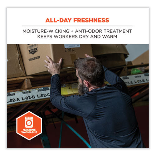 The N-Ferno 6436 Long Sleeve Lightweight Base Layer Shirt is designed for comfortable warmth in mild to cold conditions. Made with lightweight and breathable stretch fabric, it is a great base layer shirt for keeping workers warm without overheating during strenuous activity. The 180 g polyester-spandex performance material provides warmth without the constricting or bulky feel often found with heavyweight base layers. The fabric is smooth and stretchable for easily layering under sweatshirts and jackets, plus a long tail for full coverage. Unlike other base layers, this shirt is designed to sit slightly looser on the skin to enhance breathability and mobility while also providing an air gap for additional insulation. Raglan sleeves with wider underarms also make for full range of motion. Featuring moisture-wicking technology and an anti-odor treatment to keep workers comfortably fresh, dry and warm all day.