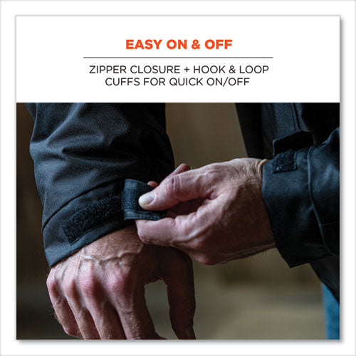 The N-Ferno 6467 Winter Work Jacket is built for warm and durable protection in cold environments. The 300D polyester oxford with breathable water-repellent coating protects from the elements, while thermal insulation and quilted sleeves keep workers comfortably warm. This work jacket features a removable hood that can easily be snapped on or off depending on weather conditions or personal preference. For a snug and custom fit that keeps cold air out, it features adjustable hook and loop cuffs, drawstring hood, drawstring waist and a long tail that won't ride up. The adjustable cuffs plus heavy-duty zippered closure also make for easy on and off with gloves. One exterior chest pocket and one interior pocket (both fit larger smartphones), plus two lower-front pockets for convenient storage. Reflective accents keep workers safe and seen. This winter work jacket is ideal for those who work in cold environments where hi-vis is not required.