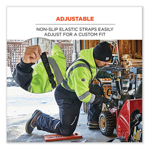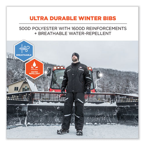 The N-Ferno 6471 Heavy-Duty Insulated Bib Overalls are designed to be worn over work pants for warmth and durability in extremely cold environments. The 500D polyester oxford with breathable water-repellent coating protects from the elements, while 3M Thinsulate insulation traps heat for enhanced warmth. These black winter work bibs hide dirt and feature 1600D reinforcements to hold up through the toughest work conditions. For convenient storage, these work bibs have one chest pocket and two side pockets. Zippers on each leg make it easy to pull on and take off the insulated bib overalls without removing work boots. 4-way stretch sides enhance comfort where you need it, and adjustable elastic straps make for a custom fit. 3M reflective accents keep wearers safe and seen. These winter work bibs are a great choice for warmth while resisting heavy wear and tear in industries such as mining, construction and manufacturing.
