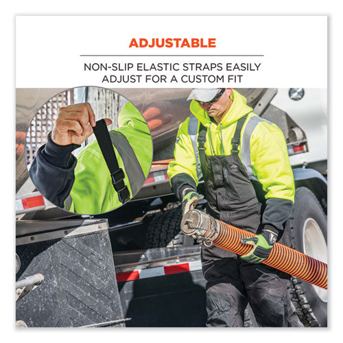 The N-Ferno 6472 Insulated Bib Overalls are designed to be worn over work pants for warmth and durability in cold environments. The 300D polyester oxford with breathable water-repellent coating protects from the elements, while the thermal insulation and quilted lining keeps workers comfortably warm. These black winter work bibs hide dirt and feature reinforced knee patches for long-lasting wear. A heavy-duty front zipper closure, comfortable elastic-stretch sides and full-length zippered pant legs make for easy on/off without removing boots. Adjustable non-slip elastic straps allow workers to get the perfect fit. For convenient storage, these work bibs have one chest pocket and two side pockets. Reflective accents keep workers safe and seen. These insulated bib overalls are ideal for those who work in cold environments where hi-vis is not required, including refrigeration, transportation, airlines or agriculture.