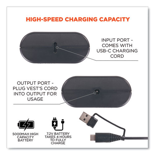 The N-Ferno 6495 Rechargeable Heated Vest features a battery power bank (7.2 V/5,000 mAh) and four heating zones around the neck collar, mid-back, and left and right chest for all-day warmth in cold to extreme conditions. This heated vest features 80 g of insulation and serves as a low-bulk mid-layer option that traps body heat and fits comfortably under bulky winter jackets and gear. A wind-resistant polyester performance exterior provides protection from the elements and a fleece lining around the collar adds warmth for all-day use. The heated vest offers warmth without compromised mobility, featuring stretchable spandex blend on the sides for a comfortable fit. Unlike typical boxy and bulky winter gear, this lightweight vest is designed for a more athletic, snug fit to keep the heating zones close to the body for maximum warmth. This vest features an elastic bungee waist for a snug and adjustable fit that keeps cold air out and a zippered closure makes for easy on and off.