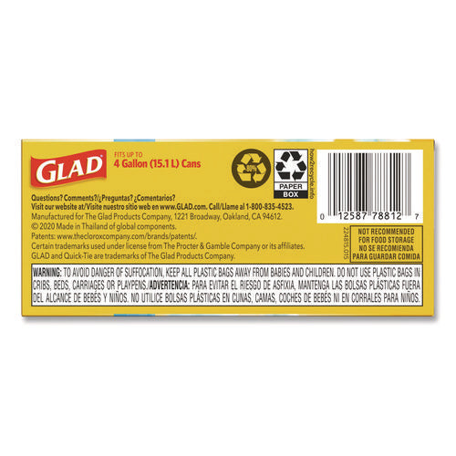 Glad OdorShield Quick-Tie Small Trash Bags with Febreze provide strength plus odor control, to keep homes and workplaces smelling fresh and clean. These small garbage bags are made with OdorShield technology and Febreze freshness to provide continuous odor neutralization, based on time lapse technical evaluation, for long lasting freshness around the house or workplace. They are also strong and sturdy to avoid messy trash disasters as you transport it. These 4 gallon size trash bags, in Fresh Clean scent, fit small size trash cans and are great for use in restroom, kitchen, desk and break room bins. Ideal for use in schools, daycare centers, restaurants, hotels and other commercial facilities.