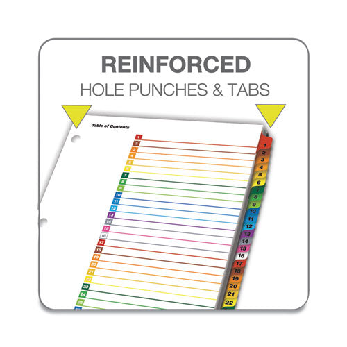 Cardinal® OneStep® Table of Contents Dividers help you create an index system instantly. Matching, preprinted tabs on the divider sheets can be used in either vertical or landscape formats. Tab sets have coordinating Table of Content sheets. Easy to use, free templates in your favorite software are available online; details on packaging. Tabs and ring edges are reinforced to withstand heavy use. Laser and inkjet compatible. Three-hole punched and sized for 8.5" x 11" sheets.