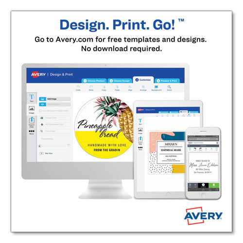 Make your product or promotion stand out in a crowd! These customizable oval labels offer just the marketing pop you need. Sure Feed® technology ensure reliable feed through printers and copiers. Backed with permanent adhesive, the labels stick to glass, plastic, paper and more, allowing you to put your mark on nearly any product. With free templates and designs from Avery® Design & Print Online, you can easily customize the labels with your unique marketing strategy in mind. New customizable marketing solutions are just a few clicks away with these premium labels.