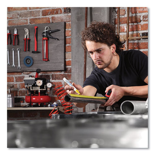 Create permanent and accurate marks on virtually any surface with uni Paint oil-based paint markers from uni-ball. These markers deliver strong and clearly visible lines. Quick-drying paint is water, fade, heat and abrasion resistant. Valve action control provides excellent flow and coverage, while also preventing the marker from drying out if left uncapped. Permanent paint colors mark opaque and glossy on both light and dark surfaces, no matter what it is applied to. The metal barrel and durable tip ensures a long marking life. Ideal for manufacturing, construction sites, automotive, metal fabrication, aviation, marking oily, greasy items and identifying parts or equipment outside.
