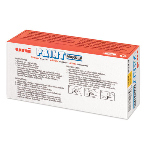 Create permanent and accurate marks on virtually any surface with uni Paint oil-based paint markers from uni-ball. These markers deliver strong and clearly visible lines. Quick-drying paint is water, fade, heat and abrasion resistant. Valve action control provides excellent flow and coverage, while also preventing the marker from drying out if left uncapped. Permanent paint colors mark opaque and glossy on both light and dark surfaces, no matter what it is applied to. The metal barrel and durable tip ensures a long marking life. Ideal for manufacturing, construction sites, automotive, metal fabrication, aviation, marking oily, greasy items and identifying parts or equipment outside.