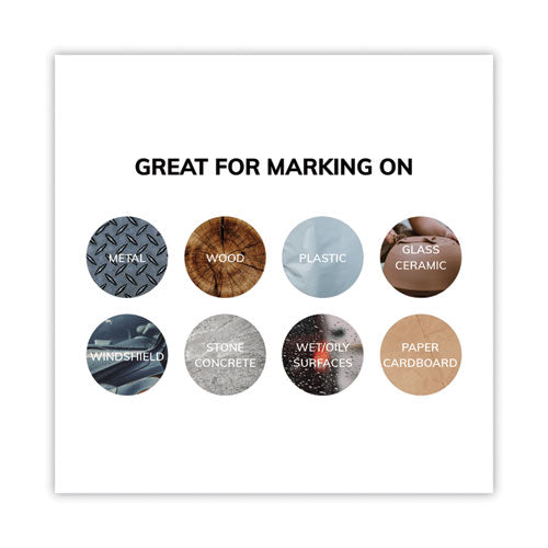 Create permanent and accurate marks on virtually any surface with uni Paint oil-based paint markers from uni-ball. These markers deliver strong and clearly visible lines. Quick-drying paint is water, fade, heat and abrasion resistant. Valve action control provides excellent flow and coverage, while also preventing the marker from drying out if left uncapped. Permanent paint colors mark opaque and glossy on both light and dark surfaces, no matter what it is applied to. The metal barrel and durable tip ensures a long marking life. Ideal for manufacturing, construction sites, automotive, metal fabrication, aviation, marking oily, greasy items and identifying parts or equipment outside.