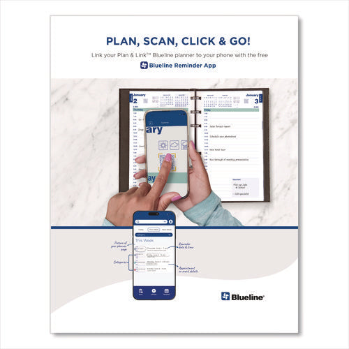 The future of planning is here with the Blueline Plan & Link™ Weekly Appointment Planner. Weekly spreads feature plenty of space for meticulous daily planning, accommodating the busiest, most hectic appointment schedules, while a daily QR Code makes it easy to integrate everything into the free Blueline Reminder app. Just plan, scan, click and go. Each columnar-format day details important holidays, moon phases and days-passed/days-remaining; and running along the bottom of each spread, a reference calendar displays all 12 months of the year. Keeping it all together, a durable, lizard-like cover and flexible twin-wire binding deliver an attractive, professional appearance while allowing the planner to lay flat when open. To reap the full benefits and push your planner to reach its full potential, download the free Blueline Reminder app, powered by inkLink, from the Apple App Store or Google Play.