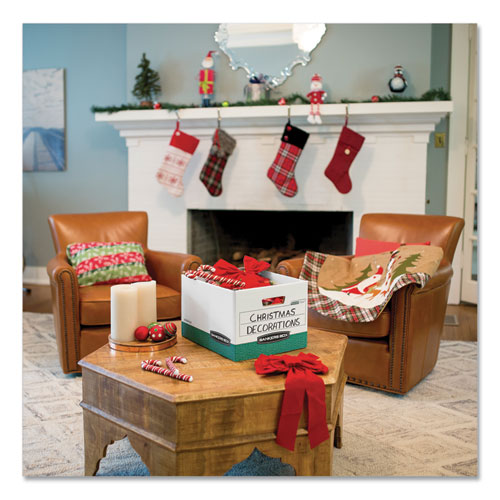 Heavy-duty, triple-end, double-side, double-bottom construction stacks up stronger and withstands frequent handling. FastFold® quick and easy assembly. Reinforced tear-resistant handles make box comfortable to carry. Deep, locking, lift-off lid stays in place for secure file storage. Smooth rolled edges add strength and prevent paper cuts.