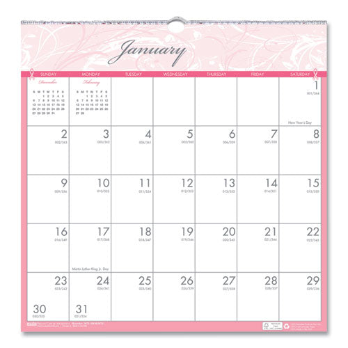 Recycled Monthly Wall Calendar, Breast Cancer Awareness Artwork, 12 X 12, White/pink/gray Sheets, 12-month (jan-dec): 2026
