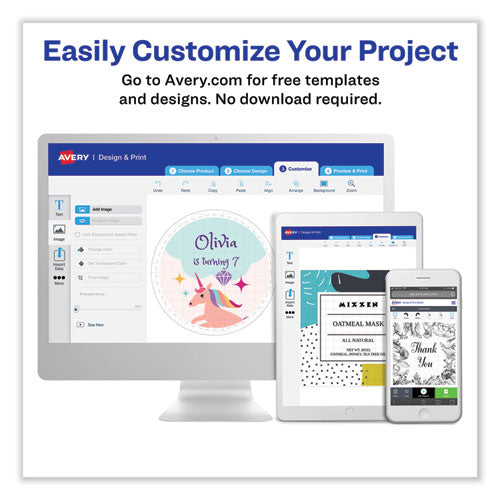 Need a versatile label that sticks around only as long as you want it to? Look no further than these print or write removable labels. Their standard or round size makes them ideal for labeling objects for sale, identifying the contents of containers, marking drawers and shelves and more. With free templates from Avery® Design & Print, it's easy to customize the labels and print. Removable adhesive makes the label stay put where you placed it but lets you peel it away easily when the label is no longer needed. With these labels, your labeling needs are met and you control the duration. Identify the contents of containers and label items for sale more quickly and conveniently.