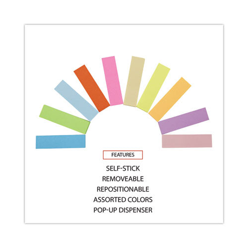 Get and stay organized by marking your page or note easily with these colorful, self-stick, pop-up page tabs. Simply remove the tab from the pad and stick it to the surface for easy identification. Use the colors to help code or take notes on the paper flags for added emphasis. Each pack comes with ten assorted color pads. Perfect for color-coding any document, book, or file. Tabs attach securely and remove cleanly.