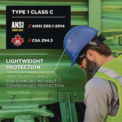 The Skullerz 8966 Class C Vented Hard Hat with 6-Point suspension provides lightweight yet durable protection to shield the top of the head from falling objects or bumping into stationary objects. This vented hard hat features a lightweight HDPE plastic shell for comfort without comprised protection. Compared to 4-Point suspension systems, the 6-Point suspension better disperses the force of an impact. For a custom and secure fit, it offers more adjustment points (36 in total) and pivots up and down to clear bandana or ponytail knots. The cap-style brim can be worn backwards to improve upward visibility, or forward to keep sun and rain away from the eyes. The ventilated, open frame design and always-open venting makes for a cooler hard hat by releasing heat buildup and allowing air to circulate-reducing perspiration in hot and humid working environments. A removable foam-backed sweatband is breathable and washable for all-day comfort. Fits hat sizes 6.5 to 8.25 (head circumference: 21" to 26".)
