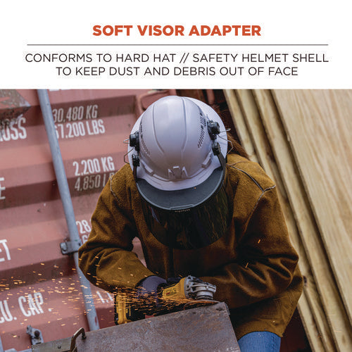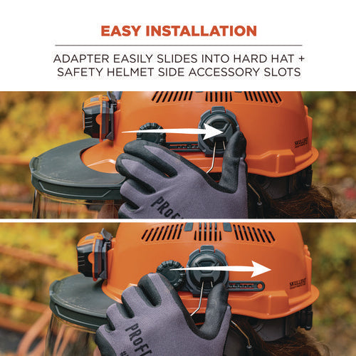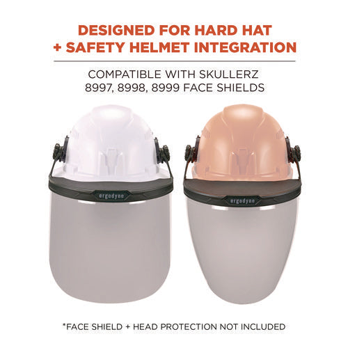 The Skullerz 8996 Face Shield Adapter Frame Replacement securely attaches to Skullerz Hard Hat and Safety Helmet side accessory slots and accepts 8997 Cap-Style Hard Hat & Safety Helmet Face Shields, 8998 Full Brim Hard Hat Face Shields and 8999 Mesh Face Shield Replacements for full face protection on the jobsite. When securely installed, this safety face shield has three pivoting positions-fully down to provide full face protection, mid-way, or fully up and out of the way. The adapter can be adjusted forward or backward to accommodate other hard hat accessories such as headlamps. Integrated accessory slots on the face shield adapter allow users to attach Skullerz Earmuffs when face shield is installed and in use.
