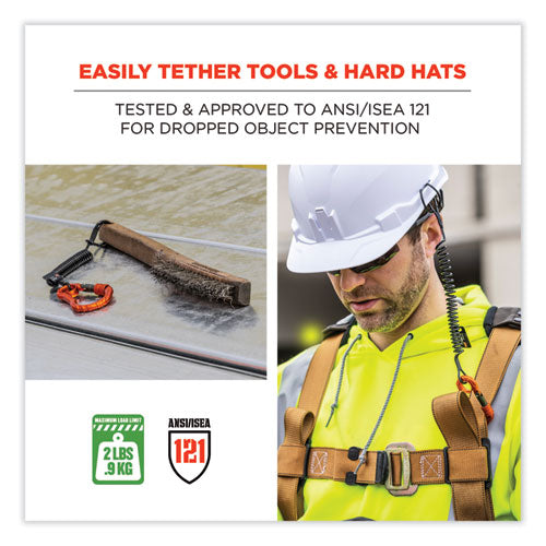 The Squids 3156 Coiled Tool Lanyard with Carabiner securely tethers hand tools, hard hats and other small gear to prevent them from becoming dangerous dropped object hazards while working at heights. The low-profile coiled design helps reduce the potential for snag and tangle hazards; and thanks to its manual locking screw gate aluminum carabiner on one end and a flexible tethering loop on the other, this versatile system provides a variety of options for getting a secure connection to anchor points, a tool's captive hole eyelets, retrofitted tool-attachment points and hard-hat accessory slots. Tested to be trusted and built to withstand harsh conditions, this lanyard is third-party certified to a maximum working capacity of 2 lb with a 2:1 safety factor.