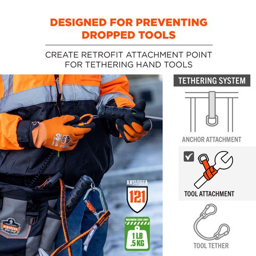 The Squids 3745 Tool Grip and Tether Attachment Point installs onto screwdrivers and nut drivers to create a retrofit attachment point for tethering tools up to 1 lb, preventing dropped or falling objects from occurring on the job. Connection points for tool lanyards can be tricky to find, especially on smaller hand tools like screwdrivers and nut drivers. While working at heights, it is important to tether tools as part of your overall fall protection plan, but the lack of these connection points can make that difficult. Designed in two pieces, this tool attachment features an end cap and a rubber sleeve. To install, slide a screwdriver or nut driver into the rubber sleeve and plug the end cap's pegs into the reinforced holes of the rubber sleeve. The sleeve features a textured rubber and is ergonomically designed to cover the entire tool handle—providing greater comfort, torque and an enhanced grip.