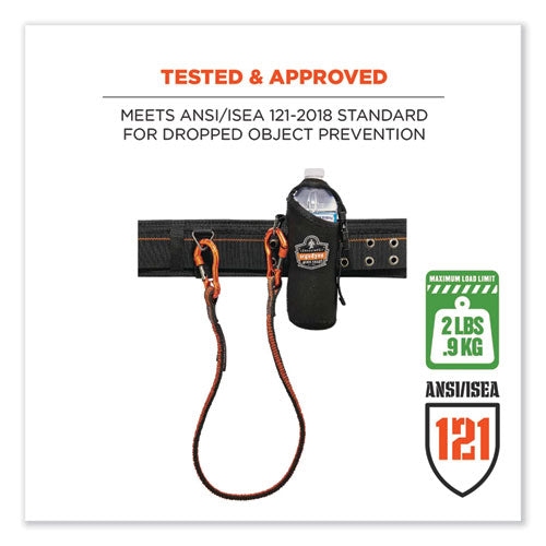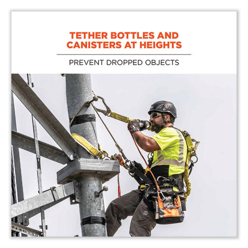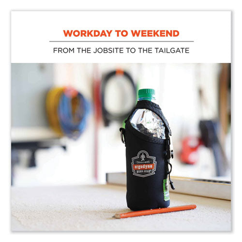 The Squids 3775 Can/Bottle Holder and Trap makes it easy to carry and secure your water bottle, spray bottle, aerosol can or other canisters of similar sizes to prevent dropped objects while working at heights. There is a zinc-plated D-ring on the backside that can be used to attach a tool lanyard to complete your tethering system. To keep your hands free, there's a stainless-steel belt clip on the side to easily attach to a tool belt or fall protection harnesses. The can and bottle holder is made of abrasion-resistant neoprene that stretches to fit 16.9 oz and 33.8 oz containers including most standard plastic water bottles or even a can of WD40. The adjustable webbing strap can accommodate a variety of bottles and cans, and features a buckle closure system to safely secure them into the holder. Constructed with heavy-gauge nylon stitching for extra reinforcement, the bottle holster is made to take on use and abuse.