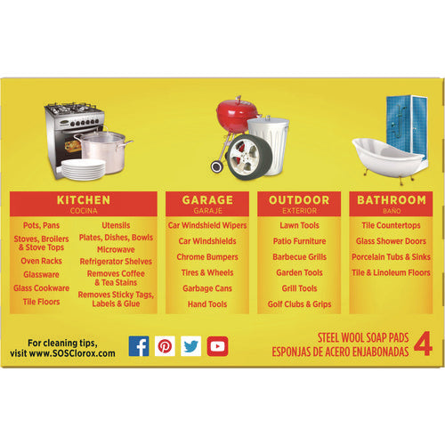S.O.S Steel Wool Soap Pads are tough so you don't have to be. Made with durable steel wool and saturated with long-lasting soap, these pads cut through even the toughest baked-on, greasy, grimy messes. They are perfect for cleaning ovens, broilers, cookie sheets and pots and pans. The durable and long-lasting design is made for the toughest jobs and can remove baked-on food from pots or pans. These reusable steel wool soap pads are great outside the kitchen, too. From scrubbing stoves and shower doors to cleaning grills and golf clubs, these pads quickly remove stubborn grease, rust and stains inside and outside the home or workplace. The soap contains rust inhibitors, preservatives, a pH buffer, fragrance and color. Makes aluminum, iron and stainless steel pots and pans sparkle. Cleaning is quick and easy with S.O.S Steel Wool Soap Pads.