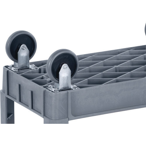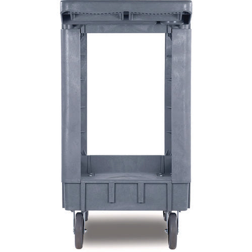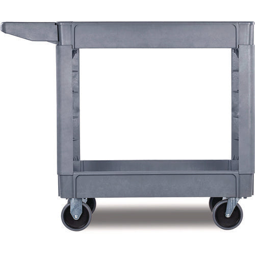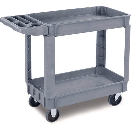Durable polypropylene construction, gray, two-shelf utility cart with casters. Molded-in plastic handle allows for easy steering on the go. The handle and raised top rim are great for hanging cleaning products and supplies to tackle cleaning jobs from one room to the next.