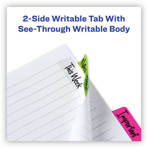 Sturdy, self-adhesive repositionable tabs that make indexing, marking, referencing and separating documents quick and easy. Writable on both sides of the tab, and the adhesive body is clear so you can see text underneath. Durable enough to turn pages like a divider, and they stick securely but remove cleanly with no residue. Ideal to use for organizing and marking key information in notebooks, files, books, planners and more. Perfect for home, office and school.