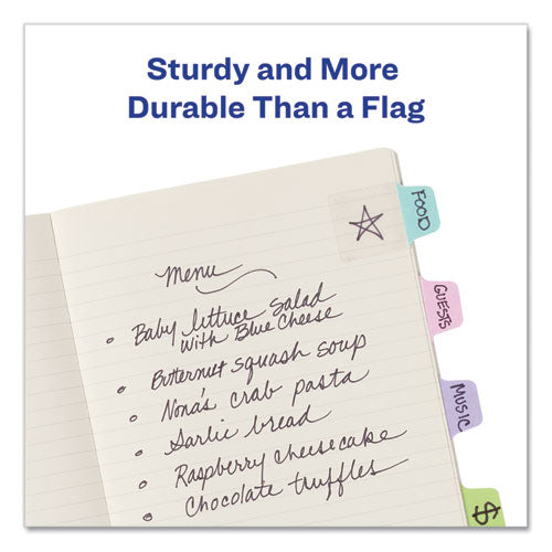 Sturdy, self-adhesive repositionable tabs that make indexing, marking, referencing and separating documents quick and easy. Writable on both sides of the tab, and the adhesive body is clear so you can see text underneath. Durable enough to turn pages like a divider, and they stick securely but remove cleanly with no residue. Ideal to use for organizing and marking key information in notebooks, files, books, planners and more. Perfect for home, office and school.